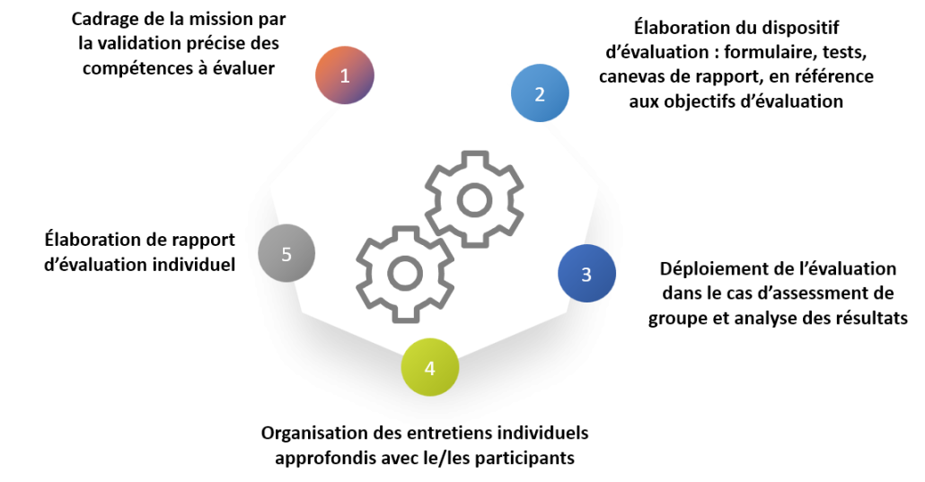 - Un Assessment center, dispositif d’évaluation consistant à apprécier en situation individuelle et/ou de groupe les comportements révélateurs des potentiels et des compétences.